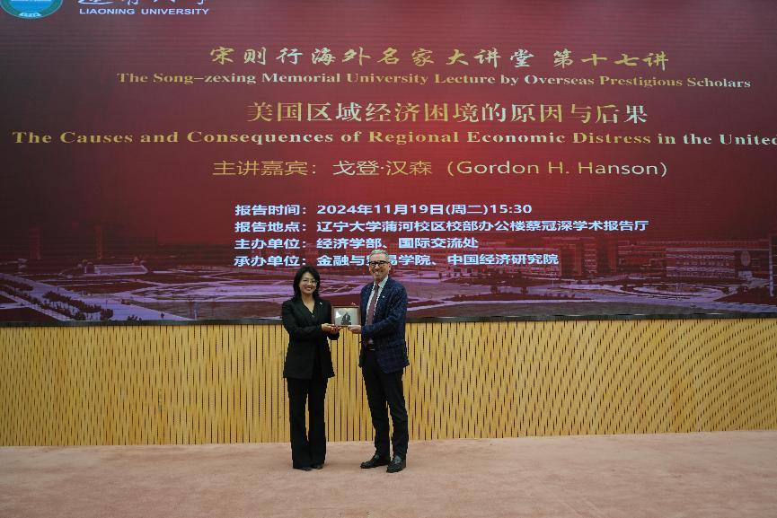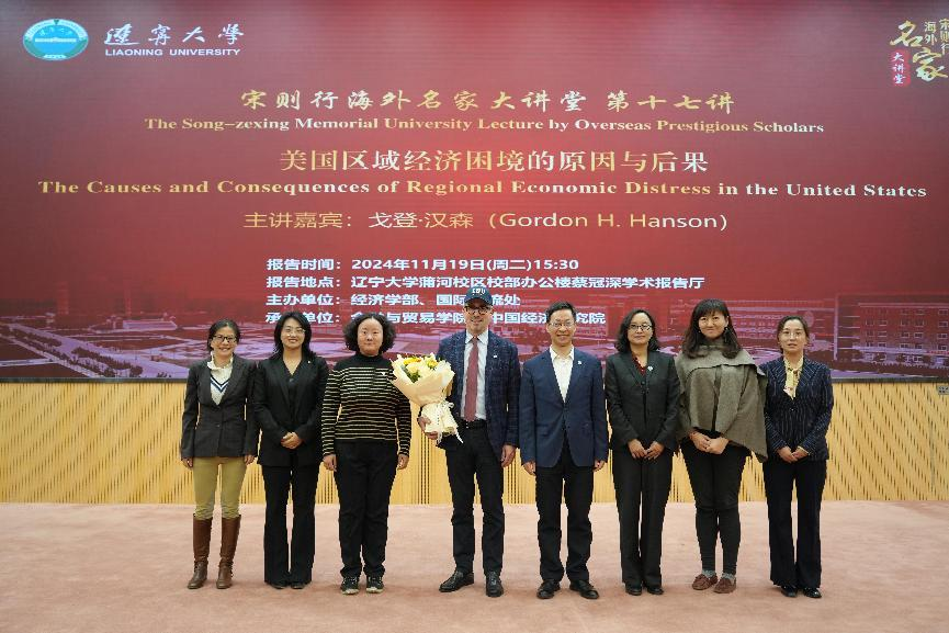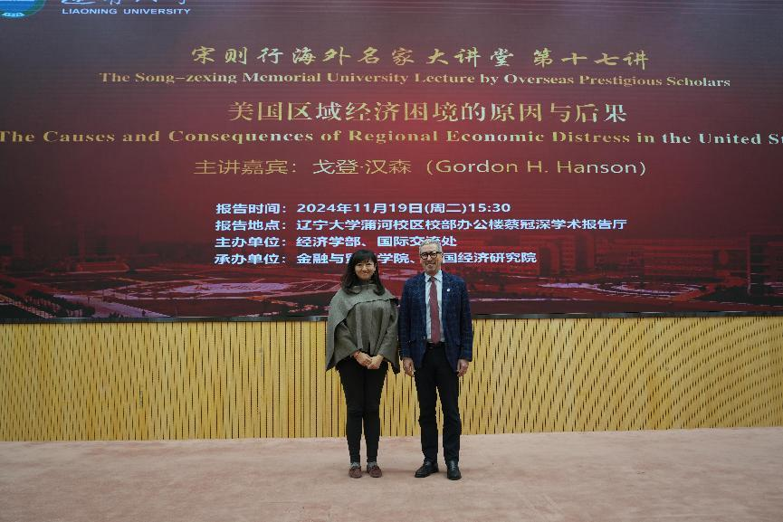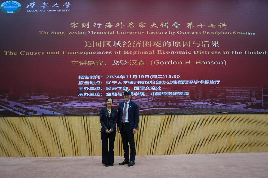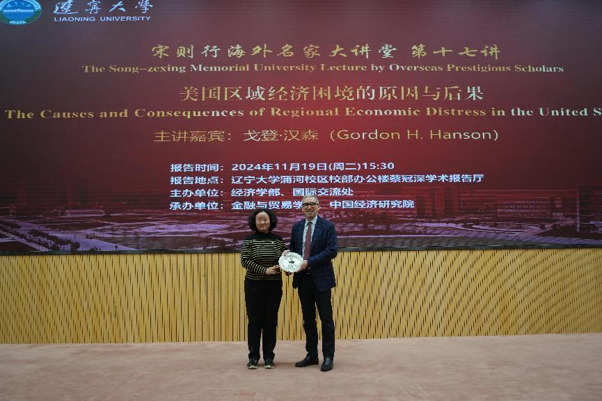 11月19日下午,国产一区二区日本在线宋则行海外名家大讲堂(第十七讲)在蒲河校区校部办公楼二楼蔡冠深学术报告厅举行。哈佛大学肯尼迪学院戈登汉森教授应邀作题为《美国地区经济困境的原因与后果》的学术报告。第十四届全国人大代表,辽宁省第十四届人大常委会委员,国产一区二区日本在线党委副书记、校长余淼杰出席报告会并致辞,副校长李宇鹏、仇焕广出席报告会,国际交流处处长谢名一、经济学部副主任王伟光、中国经济研究院副院长兼金融与贸易学院副院长马湘君、国际交流处副处长尹如玉、经济学部办公室主任孔晓参加报告会。报告会由仇焕广主持。