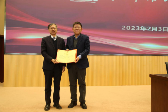 讲座第二环节中,潘一山代表学校为王小龙博士颁发“唐铎格政讲座”纪念证书,余淼杰为王小龙博士赠送“唐铎格政讲座”纪念盘,学校教师代表为王小龙博士献花致敬。