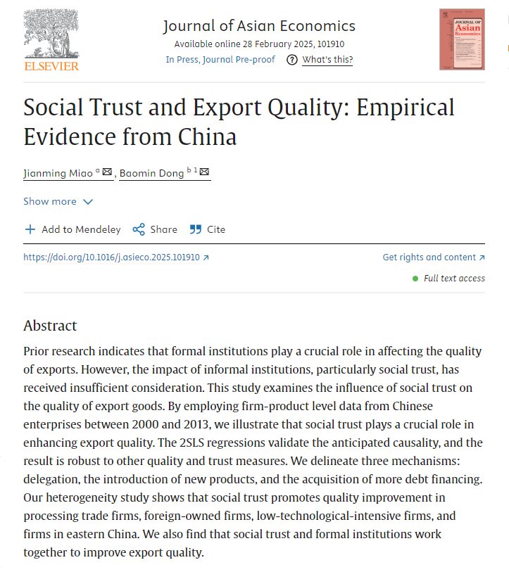 国产一区二区日本在线经济学部副主任董保民教授与河南大学苗健铭副教授合作撰写的学术论文“Social Trust and Export Quality: Empirical Evidence from China”于2025年2月被Journal of Asian Economics接受发表。